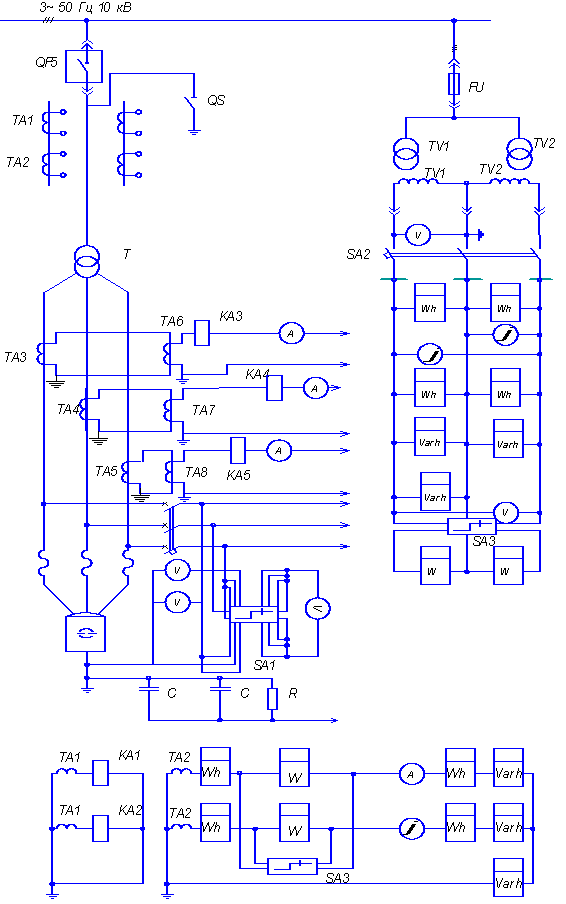 Токовые цепи измерительных приборов подключаются через трансформаторы тока типа ТПОЛМ-10, цепи напряжения - к двум трансформаторам напряжения типа НОМ-10-66Т, собранным в схему открытого треугольника.