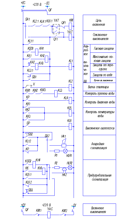 Аварийная сигнализация включается вместе с аварийным выключением ВВ, контакт KL1 . Аварийное выключение возможно при срабатывании газовой защиты KSG1 , максимально-токовой защиты КА1 , защиты от перегрузок КА2 , отсутствии протока воды KL2 . Аварийное отключение возможно нажатием кнопки SB1 .