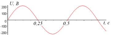 Напруга змінюється за законом U ( t ) = 220 cos (314 t + π /2) . Визначити амплітуду напруги, циклічну частоту, фазу, значення U (0) при t =0 , період T і частоту.