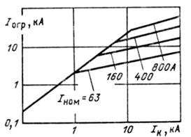 Быстродействующие предохранители выполняются с плавкими вставками из серебряной фольги в закрытых патронах с засыпкой кварцевым песком. Они рассчитаны на установку в цепях переменного тока напряжением 380-1250 В и постоянного тока 230-1050В; номинальные токи 100-2000 А, предельные токи отключения до 200кА. Эти предохранители обладают заметным токоограничивающим действием. Зависимость ограниченного тока Iогр в сети напряжением 660 В от расчетного тока КЗ Iк. при разных номинальных токах плавкой вставки Iном для быстродействующего предохранителя ПП-57 показана на рис. 1. Чем меньше номинальный ток вставки, тем меньше паров металла в дуге, тем больше сопротивление дуги и больше степень ограничения тока в цепи.