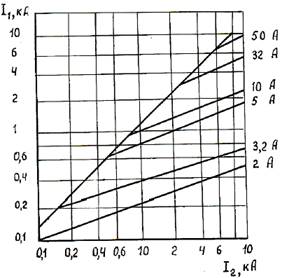 Как видно из рисунка, ограничение тока имеет место при отключённом (расчётном) токе I2, превышающим некоторое минимальное значение, зависящее от номинального тока вставки. Чем меньше последний, тем заметнее токоограничивающее действие предохранителя.