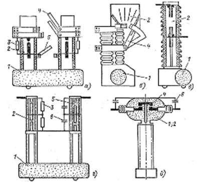 Необходимый изоляционный промежуток между контактами в отключенном положении создается в дугогасительной камере путем разведения контактов на достаточное расстояние. Выключатели, выполненные по конструктивной схеме с открытым отделителем, изготовляются для внутренней установки на напряжение 15 и 20 кВ и ток до 20000 А (серия ВВГ). В данном типе выключателей после отключения отделителя 5 прекращается подача сжатого воздуха в камеры и дугогасительные контакты замыкаются. Конструктивные схемы воздушных выключателей: