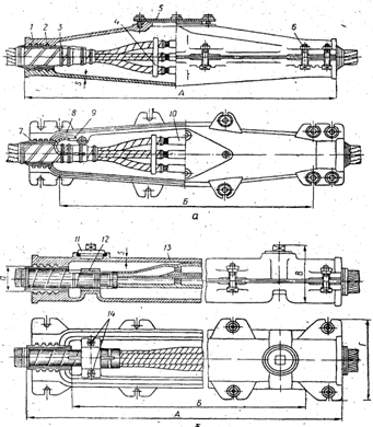 а – типу СЧо; б — СЧм; 1 — верхня половина корпусу муфти; 2 — лабіринтне ущільнення; 3 — кабель; 4 — фарфорова розпірка пластина: 5 — кришка заливального отвору муфти; 6 – стяжні болти; 7 — підмотка; 8 – герметизуюча прокладка в пазу нижньої половини корпусу муфти; 5 — заземлюючий провідник; 10 — з'єднувальна гільза; 11 — пробка заливального отвору; 12 — хомутик; 13 — ізолююча підмотка паперовими роликами; 14 – болти кріплення хомутика