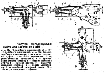 Відгалуження кабелів здійснюють за допомогою чавунних відгалужувальних муфт типу О (рис. 1) таких виконань: От— Т-подібного (рис. 1, а), Оу – У – подібного (рис. 1, б), Ок —хрестоподібного (рис. 1, в).