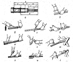 а, б, в, г, д, е, є, ж — послідовність операцій; 1 — ступені обробки заводської ізоляції; 2 – гільза; 3 — сталева струна з важками; 4 — паперова стрічка; 5 — розбортування; 6 — дерев'яний валик; 7 — паличка припою; 8 — ніж; 9 – заземлюючий провід; 10 — ділянка приєднайся заземлюючого проводу до корпусу муфти; 11 — дротяні бандажі; 12 — корпус муфти; 13 — заливальний отвір, закритий пластиною свинцю