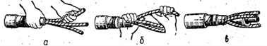 Перед обробкою кінець кабелю розправляють і на відстані А (рис. 3, а, і табл. 2) накладають поверх зовнішнього джутового покриття бандаж з 2-3 витків сталевого оцинкованого дроту (рис. 3, б). Джутове покриття розмотують від кінця кабелю до бандажа (рис. 3, в) і не зрізають, а залишають для захисту ступеня броні від корозії в майбутньому (після монтажу муфти). Розмотане джутове покриття тимчасово намотують на необроблювану частину кабелю.