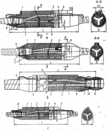 а – СЕп; б – СЕв; в – СЕм; г – СЕс; 1 – корпус муфти; 2 – розпірка; 5 — підмотка жили, 4 — бандаж з дроту; 5 — провід заземлення; 6 — з'єднання жил; 7 — бандаж з сурових ниток; 8 — герметизуюча підмотка; 9 — екран корпусу; 10— свинцева манжета