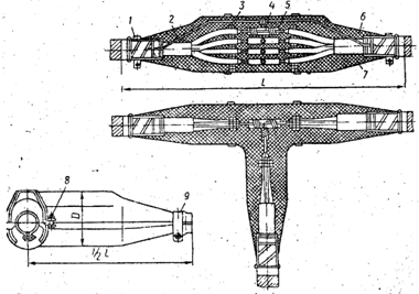 1 — підмотка з бавовняної стрічки, промазаної епоксидним компаундом — провід заземлення; 3 — розпірка; 4 — відгалуження жил: 5 — відгалужу вальна гільза; 6 — верхня половина форми; 7 — нижня половина форми; 8 — стяжний болт; 9 – хомут