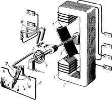 Очищают отверстия для полуосей в латунной П-образной скобе. Полочка ярма должна быть параллельна П-образной скобе и иметь ровный изгиб на всем своем протяжении. Проверяют надежность крепления гасителя колебаний 3 к латунной скобе и изоляционной колодки 7 с подвижным контактом к ярму; надежность закрепления внутреннего конца спиральной пружины в шестигранной втулке. Проверяют, с достаточным ли трением поворачивается шестигранная втулка на фасонном винте. Чистку подвижных и неподвижных контактов выполняют кусочком дерева твердых пород или кожей. Подгоревшие или имеющие выбоины контакты зачищают и полируют воронилом. Пользоваться надфилем, наждачной бумагой или другими абразивными материалами нельзя! Кроме того, недопустимо промывать контакты ацетоном или бензином, так как они образуют плохо проводящий налет.