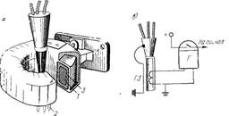 Рассмотрим пример защиты от однофазного короткого замыкания на землю кабельных линий в сети напряжением 6—10 кВ с заземленной нейтралью. На рис. 5,a приведен эскиз применяемого для такой защиты специального трансформатора тока типа ТЗ, а на рис.5,б — схема действия защиты. Действие защиты основано на том, что в нормальном режиме суммарный поток, создаваемый трехфазной системой токов в жилах кабеля, равен нулю. При замыкании на землю одной из фаз кабеля симметрия токов нарушается и возникает магнитный поток, который наведет э. д. с. в обмотке трансформатора тока ТЗ и в цепи реле Т появится ток. Реле срабатывает и дает сигнал о наличии повреждения в данной кабельной линии.