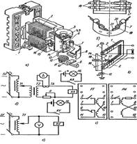Рис. 9. Реле вторичные косвенного действия тока РТ и напряжения РН: а — общий вид, б — неподвижные контакты, в — схема устройства реле, г — схема соединений, д — схема испытания реле РТ, е — то же, реле РН; SF — автомат, Т1 — автотрансформатор, Т2 — трансформатор ОСО-0,25, КА — реле тока, KV — реле напряжения, ТА — трансформатор тока, R — реостат, HL — сигнальная лампа