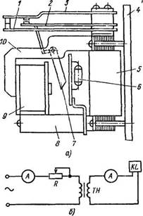 Рис. 11. Промежуточное реле РП-341: а — общий вид, б — схема регулировки, 1, 2 и 3 — контакты, 4 — основание, Б быстронасыщающийся трансформатор, 6—выпрямитель, 7 — ярмо, 8 — конденсатор, 9 — обмотка реле, 10 — сердечник, R — реостат, ТН — трансформатор нагрузочный, KL — реле