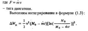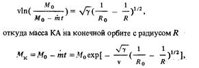 где и' и v– приращение скорости КА и скорость истечения рабочего вещества соответственно; Мо – начальная масса КА; Мк = Мо – mt – масса К А на конечной орбите. Здесь t – время перехода между орбитами; т – расход массы рабочего вещества. Из (1.1) приращение скорости