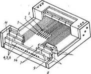 Рассмотрим конструкцию ионно-оптической системы (см. рис. 2.3), с помощью которой возможно сформировать ионные пучки с большим током (на тяжелых рабочих веществах до 20 – 30 А, на водороде – до 100 А). Формирующий, ускоряющий и замедляющий электроды выполнены в виде плоской сетки из металлических прутков, закрепленных своими концами в соответствующей паре кварцевых державок. Прутки ускоряющего и замедляющего электродов крепятся на своих кварцевых державках с помощью металлических обойм. Обоймы размещены на кварцевых державках таким образом, что при разогреве они могут удлиняться, не вызывая механических напряжений, и обеспечивают электрический контакт прутков электрода с источником питания. Пазы в кварцевых державках для крепления прутков имеют определенный шаг. Концы кварцевых державок длиной 20 – 40 мм служат для крепления электродов и для высоковольтной изоляции. Крепление и юстировка формирующего электрода осуществляется посредством прижатия Державок винтами к передней крышке разрядной камеры и винтами – через пружины к поверхности юстировочной пластины. В этом случае прутки электрода имеют непосредственный контакт с разрядной камерой. Крепление и юстировка ускоряющего и замедляющего электродов осуществляются так же, как и формирующего, только концы их кварцевых державок прижимаются к крышке разрядной камеры через соответствующие вкладыши, обеспечивающие зазор между электродами. Так как нарезка пазов в кварцевых державках производится одновременно, то прижатие их винтами к котировочной пластине обеспечивает надежную юстировку электродов (совпадайте щелей).
