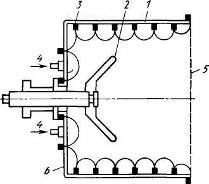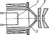Схема газоразрядного ионного источника на переменном токе представлена на рис. 2.22. Цилиндрический анод 3 источника разделен на три части, либо на кратное трем число частей, которые по одной или группами коммутируются с фазами питающего трансформатора. Нулевая точка трансформатора Л соединена с корпусом камеры.