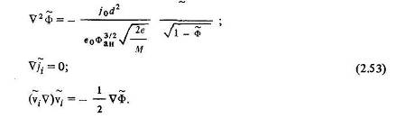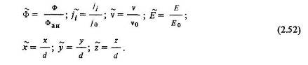 Введем масштабы величин, входящих в основные уравнения и в граничные условия. В качестве масштаба потенциала естественно принять потенциал анода Фан , в качестве линейного масштаба – ускоряющую длину а, в качестве масштаба скорости – скорость v0 = V-Фан приобретаемую ионами при прохождении разности потенциалов, равной масштабу потенциала. За масштаб плотности ионного тока примем среднюю плотность ионного тока /0 на анодной поверхности (поверхности ионного источника), за масштаб напряженности – среднюю напряженность электрического поля в ускоряющем пространстве Ео = Фан /У. Безразмерные переменные условимся отмечать значком ~: