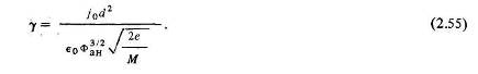 Выражение для критерия подобия у можно представить в более простом виде, если ввести в рассмотрение эквивалентный плоский диод. Так называется двухэлектродный плоский ускоритель, работающий в режиме ограничения тока пространственным зарядом, в котором ускоряющее напряжение и средняя плотность тока на анодной поверхности такие же, как в рассматриваемой ионно-оптической системе. Межэлектродное расстояние в эквивалентном плоском диоде обозначим сэ . Согласно закону Ленгмюра–Богуславского