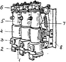Где: 1 – крышка; 2,6 – зажимы; 3 – фланец; 4 – бак; 5 – корпус; 7 \ - изолирующая тяга; 8 – вал.