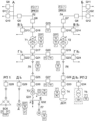 Необходимо выбрать типы защит всех элементов приведенной схемы в соответствии с ПУЭ. Выбранные защиты в условном изображении нанести на схему. Произвести расчет величин токов короткого замыкания. Произвести расчет защит следующих объектов: силового трансформатора Т1 (выключатель Q16), воздушных линий Л2 (выключатель Q5), кабельной линии Л5 (выключатель Q21), сборных шин (секционный выключатель Q15), трансформатора Т3 (выключатель Q30), двигателя Д (выключатель Q29).