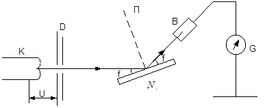 Електронний пучок, який вилітав із нагрітої нитки катода К, прискорювався полем з різницею потенціалів U , і проходячи через ряд діафрагм Д у вигляді досить вузького пучка, падав на монокристал нікелю. Іонізаційна камера В, яка з’єднувалась з гальванометромG, вимірювала величину струму І, пропорційну числу електронів, відбитих від грані монокристала нікелю. Кут fпід час досліду залишався сталим.