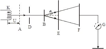На рис. 1.3 К ― нагрітий катод, який є джерелом електронів; А ― сітка, яка створює прискорюване поле для цих електронів;Д ― діафрагма, яка дозволяє виділити вузький пучок електронів; В ― алюмінієва фольга; Е ― пластинка з двома круглими отворами, через які можуть пройти лише ті електрони, які розсіялись під кутом . Далі розміщена пластинаF , з’єднана з електрометром G , за допомогою якого вимірюють електричний струм I .