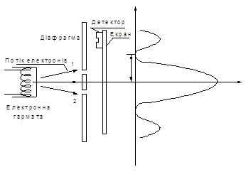 Найбільш наочні експериментальні результати, які підтверджують хвильову природу електронів, отримані в дослідах по дифракції електронів на двох щілинах, виконаних уперше в 1961 р. К. Йенсоном. Ці досліди ― пряма аналогія досліду Юнга для видимого світла. Схема досліду показана на рис. 1.3 а.