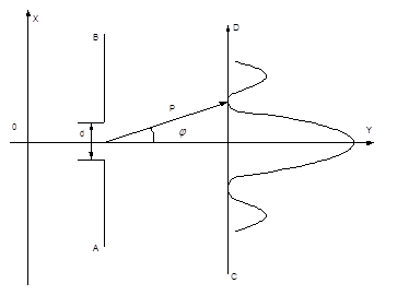 Екран АВ із щілиною шириною d розміщено перпендикулярно до пучка. На другому екраніСД одержано розподіл інтенсивності, який збігається з розподілом інтенсивності при дифракції світла від однієї щілини.