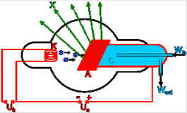 Схематическое изображение рентгеновской трубки. X - рентгеновские лучи, K - катод, А - анод (иногда называемый антикатодом), С - теплоотвод, Uh - напряжение накала катода, Ua - ускоряющее напряжение, Win - впуск водяного охлаждения, Wout - выпуск водяного охлаждения (см. рентгеновская трубка).