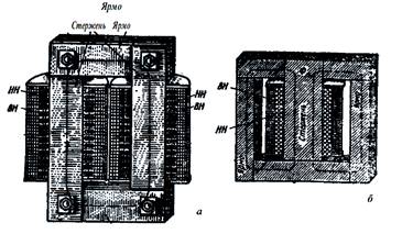 Рис.2.Однофазные трансформаторы стержневого (а) и броневого (б) типов