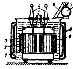 В трансформаторах с масляным охлаждением магнитопровод с обмотками помещен в бак, наполненный трансформаторным маслом (рис.9). Омывая обмотки 2 и 3, магнитопровод 7, трансформаторное масло отбирает от них тепло и, обладая более высокой теплопроводностью, чем воздух, через стенки бака 9 и трубы радиатора 8 отдает его в окружающую среду. Наличие трансформаторного масла обеспечивает более надежную работу высоковольтных трансформаторов, так как электрическая прочность масла намного выше, чем воздуха.