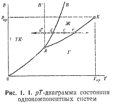 Рідкий стан речовини є проміжним між твердим і газоподібним (мал. 1.1). Область існування рідини обмежена з боку низьких температур переходом в твердий стан (точки cdd') аз боку високих — переходом в газоподібний стан (точки с, е).ЛініяАК, щорозділяє рідку і газоподібну фази, закінчується критичною точкою, відповідній температурі Ткр і тиску Pкр , вище за яких неможливе існування рідини в рівновазі з парою. Лінія рівноваги рідина — тверда фаза критичної точки не має. У металів температура плавлення підвищується із збільшенням тиску (крива АВ); у льоду, кремнію, германію — знижується (криваАВ'). ТочкаА надіаграмі стану відповідає температурі і тиску, при яких в закритій посудині знаходяться в рівновазі тверда, рідка і газоподібна фази. Рідині поєднують деякі властивості як твердих тіл, так і газів. Тверді тіла бувають кристалічні і аморфні. По типах зв'язку кристали діляться на атомні, іонні, металеві і молекулярні. Вони мають ближній і дальній порядок. Ближній порядок означає правильне розташування біля фіксованого атома, іона або молекули певного числа найближчих сусідів. Дальнім порядком називається розташування частинок в певній послідовності з утворенням єдиної тривимірної гратки. За наявності дальнього порядку відстань до будь-якого атома кристала обчислюється через параметри елементарної комірки по формулі