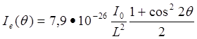 де (1+cos2 2θ)/2 = ρ(θ) — кутова залежність інтенсивності розсіяного рентгенівського випромінювання одним електроном названа поляризаційним чинником. Наявність цього множника у формулі (21) указує на те, що рентгенівське випромінювання при розсіянні частково поляризується. При гранично малих кутах розсіювання поляризаційний чинник рівний одиниці. Із збільшенням кута розсіювання цей чинник зменшується і при 2θ = 90° досягає значення, рівного 1/2. Таким чином, в різних напрямах інтенсивність розсіювання рентгенівського випромінювання одним електроном неоднакова. У напрямі первинного пучка і у зворотному напрямі інтенсивність розсіювання максимальна, а в перпендикулярному напрямі — мінімальна. Якщо у формулу (21) підставити значення постійних m, e і cто одержимо