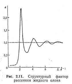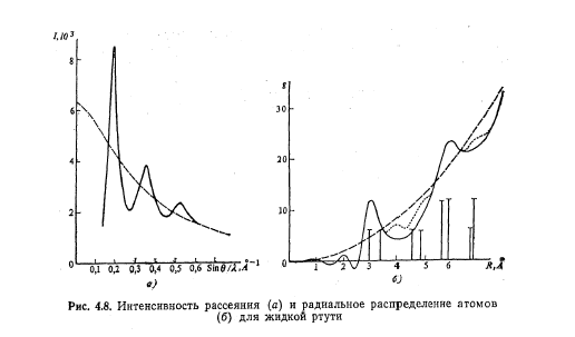 На мал. 4.8 приведені нормована крива інтенсивності і крива 4πR2 ρ(R) одержані для рідкої ртуті А. Ф. Ськришевськім сумісне з Д. П. Карлікової і Д. Н. Карликовим. Вимірювання інтенсивності проведені до значення sinθ/λ = 0,62 Å-1 що відповідає Smax = 7,8 Å-1 . Поява помилкових максимумів по обидві сторони від істинних на кривій 4πR2 ρ(R) можна чекати при 2,1 і 4,13 Å для R1 = 3,12 Å і при 5,2 і 7,1 Å для R2 = 6,2 Å.