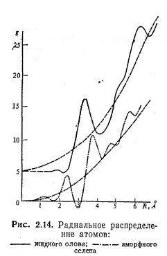 Рідини. Амплітуда теплових коливань атомів біля положень рівноваги в рідині набагато більше, ніж в кристалах. До того ж атоми рідини, беручи участь в тепловому русі, безперервно обмінюються своїми найближчими сусідами. Якщо в думках прослідити за рухом якого-небудь атома в рідині, то можна переконатися, що за час спостереження він знаходитиметься на самих різних відстанях від фіксованого атома. Внаслідок цього функція W(R) буде безперервною. У інтервалі 2r<R<R0 вона осцилює щодо одиниці з амплітудою, що постійно зменшується. Максимуми цих осциляції відповідають вірогіднішим міжатомним відстаням, мінімуми — відстаням, на яких атоми знаходяться порівняно рідко. Послідовність максимумів W(R) відповідає послідовності рівноважних міжатомних відстаней в рідині і тому визначає ту впорядкованість на близьких відстанях, яка характеризує розташування атомів в речовині. При збільшенні відстані розташування атомів по відношенню до фіксованого рівноімовірне, причому функція W(R)→1, коли R>>r.