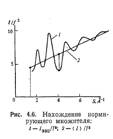 У ньому невідомими є нормуючий множник kі доданок <I(S)>/f2 (S). Як показують дослідження, значення функції розподілу сильно залежать від нормуючого множника k, тому виникає питання, як його визначити. З (147) витікає, що крива Iэкс (S) повинна осцилювати навколо кривої <I(S)>. Отже, крива Iэкс (S)/f2 (S) також повинна осцилювати навколо кривої <I(S)>/f2 (S). Хід цієї кривої можна визначити графічно. Для цього за експериментальними даними слід побудувати графік функції Iэкс (S)/f2 (S) залежно від S. Потім провести криву <I(S)>/f2 (S) так, щоб виконувалася умова