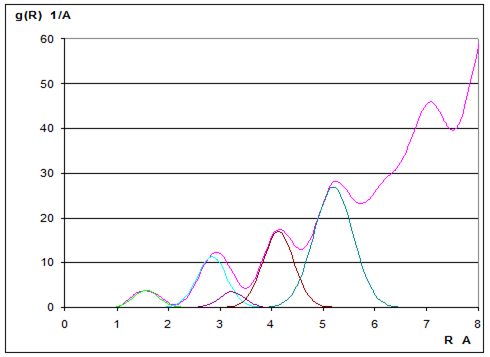 3. По отриманим дифрактограмам були визначені залежності інтенсивності від кута; і ці значення були занесені в спеціальну програму середовища Excelза допомогою якої були внесені необхідні поправки і побудована радіальна функція густини.