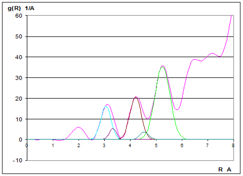 4. З побудованих радіальних функцій в середовище Excel були визначенні відстані та координаційні числа шляхом заміни кривої радіальної функції сумою чотирьох гаусовських кривих. Для вихідного Мо координаційні числа на відстанях першої, 3-ї та 4-ї координаційних сфер дуже близькі до кристалічного Мо, а координаційне число 2-ї координаційної сфери значно менше ніж в кристалічному. Таким чином були встановлені відстані для чотирьох координаційних сфер. При відпалах відстані координаційних сфер спочатку збільшуються, а потім зменшуються але не суттєво; але при 700 ºС третя координаційна сфера по суті має дві відстані: 4,2 Å та 4,54 Å, що свідчать про початок суттєвої перебудови структури.