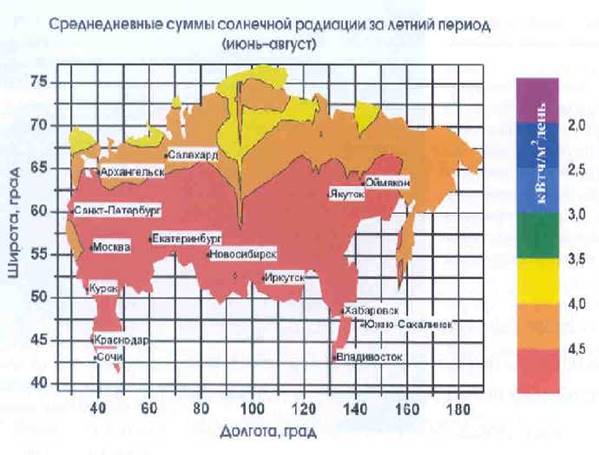 Большая часть территории нашей страны (более 60%) характеризуются среднегодовым поступлением солнечной радиации от 3,5 до 4,5 кВт-ч/м день (приложение 1). То есть, солнечные батареи, к примеру, в Приморском крае будут работать так же эффективно, как и на Северном Кавказе.