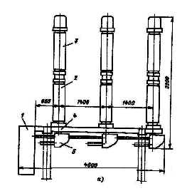 В установках. 110 и 220 кВ находят применение выключатели серии ВМТ (рис.8, а). Три полюса выключателя ВМТ-110 установлены на общем сварном основании 4 и управляются пружинным приводом 1. Полюс выключателя представляет собой маслонаполненную колонну, состоящую из опорного изолятора 2, дугогасительного устройства 3, механизма управления 5 и электроподогревательных устройств.