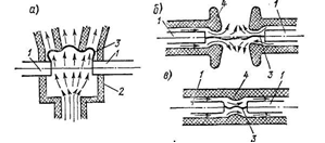 Во всех конструкциях малообъемных выключателей с продольным, поперечным или смешанным дутьем при размыкании контактов возникает сильная струя масла, которая интенсивно охлаждает ствол дуги и деионизирует его. При этом наиболее эффективным оказалось поперечное масляное дутье.