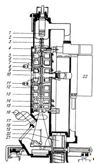 16 – бинокуляр (увеличение 12); 17 – вакуумный блок колонны; 18 – камера для 35-миллиметровой катушечной пленки; 19 – экран для фокусировки; 20 – камера для пластинок; 21 – главный экран; 22 – ионный сорбционный насос.