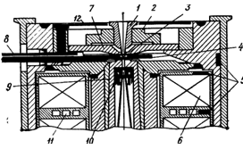В этой удачной промышленной конструкции диаметр отверстия верхнего полюсного наконечника 2R1 =9 мм, диаметр отверстия нижнего полюсного наконечника 2R2 =3 мм и межполюсный зазор S=5 мм (R1 , R2 и S определены на рис.2): 1 – объектодержатель, 2 – столик образца, 3 – образец, 4 – объективная диафрагма, 5 – термисторы, 6 – обмотка линзы, 7 – верхний полюсный наконечник, 8 – охлаждаемый стержень, 9 – нижний полюсный наконечник, 10 – стигматор, 11 – каналы системы охлаждения, 12 – охлаждаемая диафрагма