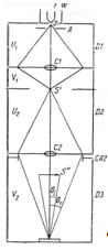 Система имеет две конденсорные линзы С1 (сильная линза) и С2 (слабая линза). F – катод; W – цилиндр Вепельта; S – мнимый источник электронов, S' и S" – его изображения; СА2 – вторая конденсорная диафрагма. Расстояния U 1 , U 2 , V 1 ,V 2 являются электронно-оптическими параметрами, тогда как расстояния D 1 , D 2 , D 3 легко измеряются в колонне микроскопа. [4].