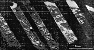 Электронная микроскопия применялась также для определения возраста земных, лунных и метеоритных пород. При этом было использовано то обстоятельство, что во время радиоактивного распада ядра высвобождаются частицы, проникающие в окружающий материал с высокой скоростью и оставляющие видимый "след" в кристалле. Такие треки можно увидеть с помощью электронного микроскопа, используяего в режимах сканирования или на просвет. Плотность треков распада вокруг радиоактивного включения пропорциональна возрасту кристалла, а их длина является функцией энергии частицы. Длинные треки, указывающие на высокую энергию частиц, были обнаружены вокруг включений витлокита в лунной породе; Хатчеон и Прайс приписали этот необычайно длинный трек распаду элемента 244 Ро, который из-за короткого периода полураспада к настоящему времени исчез, но еще мог существовать 4 млрд. лет назад. Треки в материале, взятом с поверхности Луны или из метеоритов (рис. 7) [5], дают информацию об эволюции космической радиации и позволяют сделать выводы о возрасте и составе Вселенной.