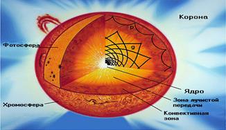 В центральной части Солнца находится источник его энергии, или, говоря образным языком, та “печка”, которая нагревает его и не даёт ему остыть. Эта область называется ядром (см. рис.1). В ядре, где температура достигает 15 МК, происходит выделение энергии. Ядро имеет радиус не более четверти общего радиуса Солнца. Однако в его объёме сосредоточена половина солнечной массы и выделяется практически вся энергия, которая поддерживает свечение Солнца.