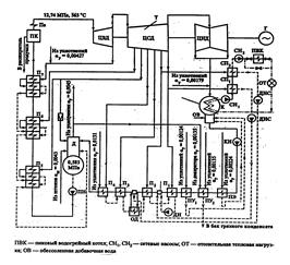 Полученные в результате расчета тепловой схемы энергоблока при номинальном режиме (при температуре наружного воздухаtнар = -50С)расходы пара, воды,конденсата и топлива используются при выборе типового оборудования и трубопроводов энергоблока и электростанции в целом.