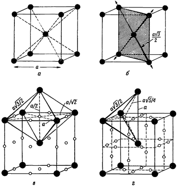 Також структура ОЦК має два типи порожнеч. Відносно великі порожнечі займають грані кубу елементарної комірки (рис. 1.2, г). Ці порожнечі оточені чотирма атомами, що розташовані у вершинах правильного тетраедра. Більш дрібні порожнечі, оточені шістьма атомами, що займають місця у вершинах неправильного октаедра, розташовуються посередині ребер і граней куба елементарного осередку (рис. 1.2, в). Якщо уявити, що структура ОЦК побудована з шарів радіусом r, то в тетраедричні порожнечі можна помістити сферу радіусом 0,291r, а в октаедричні - 0,154r. Таким чином, максимальний розмір сфери, яку можна помістити в порожнечі кубічної об’ємноцентрованої ґратки, утвореної з твердих куль, виявляється менше сфери, яку можна помістити в порожнечі більш щільноупакованих решіток гранецентрованого куба.