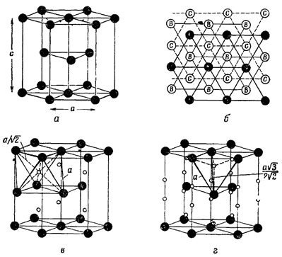 Гексагональна щільноупакована структура також як і інші структури має порожнечі. Цих порожнеч два типи: октаедричні порожнечі (рис. 1.3, в), тетраедричні порожнечі (рис. 1.3, г). Вони розташовані в центрах правильних октаедрів або тетраедрів, тобто в такий же спосіб, як і у випадку кубічної гранецентрованої решітки.