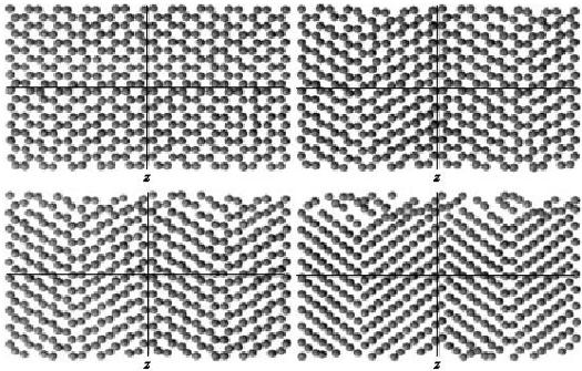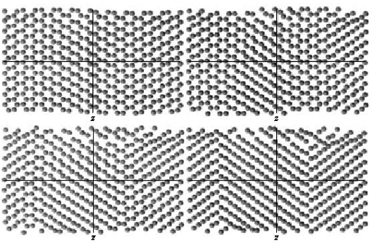 Динаміку переходу α→β можна спостерігати на рис. 2.1, де зображені миттєві положення атомів у різні моменти часу МД-моделювання. На верхньому лівому малюнку показана вихідна α-фаза з ГЩП-решіткою перед початком температурного переходу, на верхньому правом - стан кристаліта через 300 тимчасових кроків. Видно, що перебудова структури починається практично одночасно у всім об’ємі розглянутого кристаліта. При цьому зсуву атомів відповідають двом типам коливань: короткохвильовим, що змінюють локальну структуру, і довжинохвильовим, що приводять до утворення двійникової структури. На нижньому лівому малюнку (t = 600кроків) показаний момент часу, коли формування двійників у результаті структурного переходу в β-фазу в основному закінчилося, хоча атоми, розташовані на границі областей, усе ще зберігають локальне оточення вихідної α-фази. І нарешті, через 1000 кроків (нижній правий малюнок) відбувається повна пері-будівництво атомів на границях двійників. Надалі отримана β-фаза залишається стабільної протягом усього часу спостереження.
