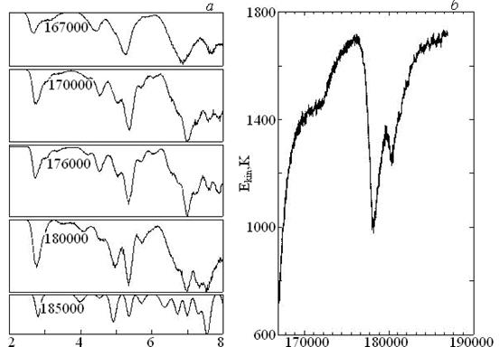 Зі зниженням температури спостерігається зворотний перехід з β-в α-фазу. На рис. 2.2 наведені ФРРА й показана зміна згодом кінетичної енергії кристаліта, вираженої в температурних одиницях. Зменшення кінетичної енергії на початковому етапі (рис. 2.2, b) відповідає відводу тепла при МД-моделюванні. Після досягнення температури, близької до 750K, починається перебудова атомів, що виражається в різкому збільшенні кінетичної енергії. Як показує аналіз атомної структури, аналогічний проведеному для рис. 3, перший основний максимум кінетичної енергії на 180000 кроці пов'язаний з перебудовою атомів на границі двійників, потім протягом короткого проміжку часу відбувається перехід у ГЩП-структуру в іншій частині кристаліта. Початок цього переходу збігається з появою другого піка на кривій кінетичній енергії. Подальше охолодження приводить до виникнення однорідної й стабільної α-фази цирконію. На рис. 2.2,a показані функції радіального розподілу залежно від часу моделювання. Числа біля кривих позначають номер кроку відповідно до рис. 2.2, b.